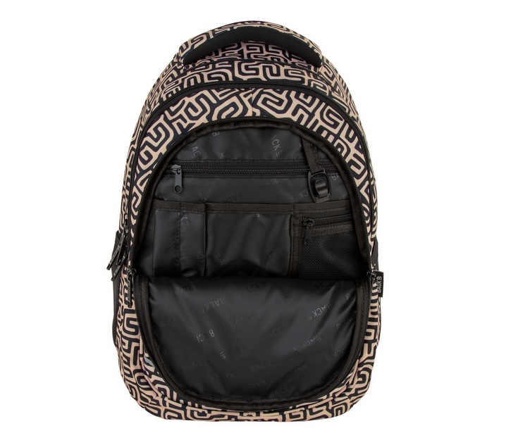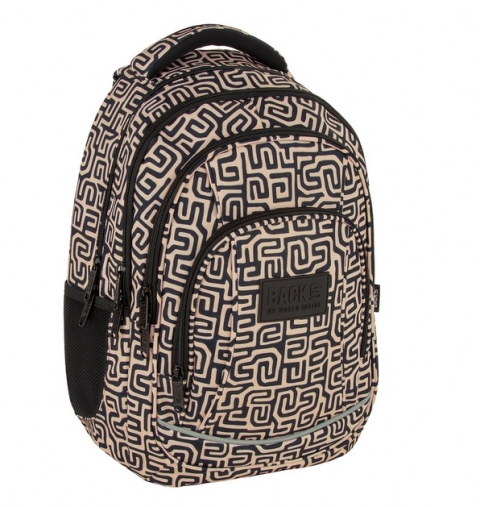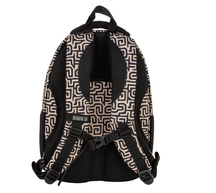 Plecak zdobi abstrakcyjny, geometryczny labirynt złożony z grubo rysowanych, nieregularnych linii. Subtelne przeplatanie zamkniętych i otwartych przestrzeni przypomina meandrujące ścieżki, które swoją unikalnością przyciągają uwagę. Czarne linie idealnie kontrastują z beżowym tłem, nadając minimalistyczny, ale dynamiczny efekt. Połączenie czerni i beżu tworzy uniwersalną bazę kolorystyczną, która pasuje do różnych stylizacji i pozostaje ponadczasowa.
