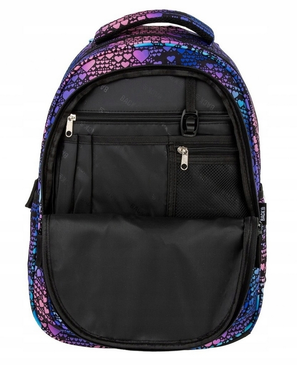 - w przedniej komorze kieszonkę z siateczki na zamek błyskawiczny, uchwyt na klucze, przegródki na długopisy, legitymację oraz większą kieszeń na chusteczki, płyn antybakteryjny, czy gumy do żucia