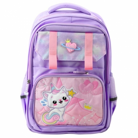 FIOLETOWY PLECAK SZKOLNY Z KOTKIEM I ELEMENTAMI ODBLASKOWYMI Fioletowy plecak szkolny z uroczym motywem kotka i kolorowymi elementami to połączenie estetyki, funkcjonalności i komfortu. Zaprojektowany z myślą o codziennym użytkowaniu przez najmłodszych, świetnie sprawdzi się jako plecak do szkoły. Model posiada dwie przestronne komory, z czego główna wyposażona jest w wewnętrzną przegrodę, która ułatwia organizację książek, zeszytów i innych przyborów szkolnych. Na froncie umieszczono dwie dodatkowe kieszenie, a po bokach elastyczne kieszenie na butelkę lub bidon. Plecak posiada usztywniane, miękkie plecy oraz regulowany pas piersiowy, który poprawia dopasowanie i zapewnia lepszą stabilność w czasie noszenia. Elementy odblaskowe dbają o bezpieczeństwo dziecka w warunkach ograniczonej widoczności. SPECYFIKACJA: Wymiary plecaka: 41 x 30 x 16 cm Pojemność w litrach: 20L Materiał: Trwała tkanina syntetyczna Ilość kieszeni: 6 (2 komory, 2 kieszenie frontowe, 2 kieszenie boczne) System nośny: Usztywniane i miękkie plecy, regulowane szelki, pas piersiowy Dodatki: Motyw kotka, kolorowe elementy, odblaskowe wstawki ZAWARTOŚĆ ZESTAWU: Plecak szkolny z przegrodą wewnętrzną