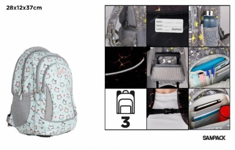 Plecak trzykomorowy Kotki szaro-miętowy 28x12x37cm