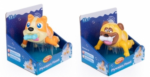 Uroczy piesek, z którym każda kąpiel zamieni się w wesołą zabawę. W pyszczku zwierzaka znajduje się kość na sznurku. Po pociągnięciu za smakołyk, piesek zaaportuje kość, płynąc do niej i zabawnie kręcąc przy tym łapkami. Zabawka dostępna jest w dwóch różnych wzorach