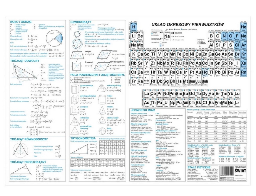 Podkład oklejany na biurko Świat. Druga strona zawiera: układ okresowy pierwiastków, jednostki miar, wzory matematyczne.
