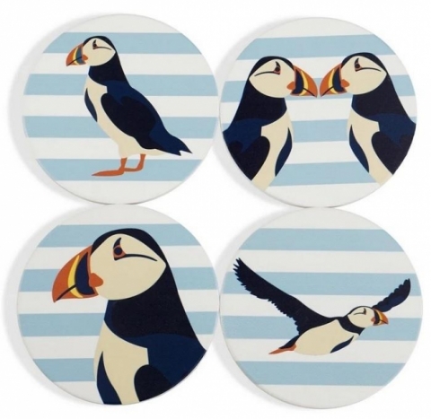 Oto subtelne, artystyczne RSPB Podkładki pod kubek ceramiczne 4 szt. - Maskonury (Puffin Blue) z motywem sympatycznego maskonura (puffina). Ten czteroelementowy zestaw zachwyca delikatnym, morskim tłem i misternie wykonanymi grafikami, które łączą estetykę z praktycznym zastosowaniem.