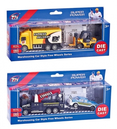 Zestaw pojazdów budowlanych wykonanych z tworzywa sztucznego, posiada elementy metalowe. W zestawie dwa pojazdy. Ciężarówka z wózkiem widłowym lub holownik z autem. Produkt występuje w kilku wersjach kolorystycznych, wybierany losowo. Cena dotyczy jednej sztuki. Zabawka przeznaczona dla dzieci od lat 3. Produkt zapakowany w kartonowe pudełko. Wymiary opakowania są wymiarami pudełka.