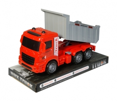Samochód ciężarowy – wywrotka w kolorze czerwonym z ruchomą skrzynią ładunkową. Zabawka przeznaczona dla dzieci od lat 3. Produkt zapakowany w kartonową podstawkę z przezroczystym kloszem. Podane wymiary są wymiarami produktu w opakowaniu.
