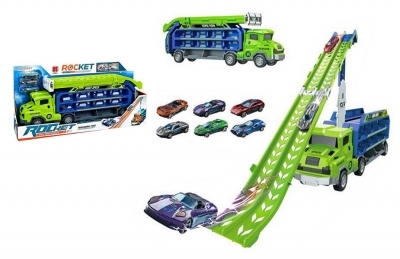 Zestaw z ciężarówką – laweta z funkcją wyrzutni oraz z 3 metalowymi autkami. Zabawka przeznaczona dla dzieci od lat 3. Całość zapakowana w kartonowe pudełko. Podane wymiary są wymiarami opakowania.