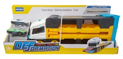 Zestaw ciężarówka laweta z dwoma samochodzikami sportowymi. Laweta jest rozkładana do formy toru z wyrzutnią, ma funkcję wyrzucania autek z przyczepy. Zabawka przeznaczona dla dzieci od lat 3. Zabawka zapakowana w kartonowe pudełko. Podane wymiary są wymiarami opakowania.
