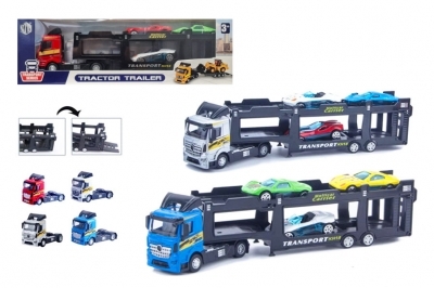 Duża ciężarówka z przyczepą do transportu samochodów. W zestawie kilka kolorowych autek. Ruchome elementy uatrakcyjniają zabawę.