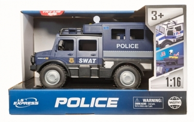 Samochód policyjny z efektami dźwiękowymi i świetlnymi. Pojazd wydaje dźwięki odpalania silnika czy syreny alarmowej. Zabawka działa na baterie AG13. Baterie znajdują się w zabawce. Zabawka przeznaczona dla dzieci od lat 3. Zabawka zapakowana w kartonowe pudełko. Podane wymiary są wymiarami opakowania.