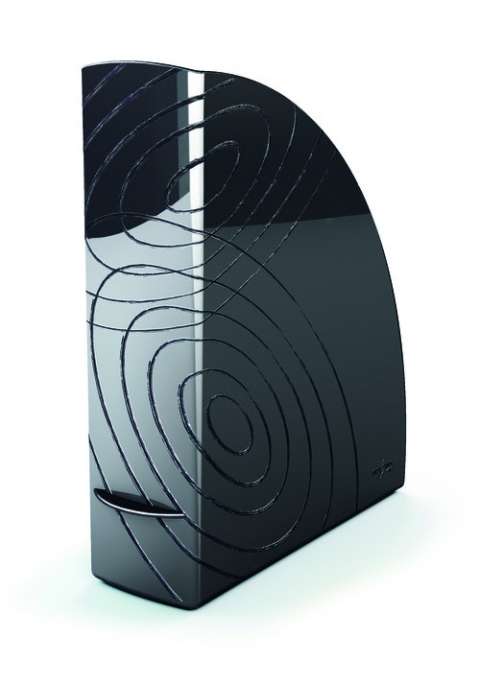 pojemnik na czasopisma, wykonany z odpornego na pęknięcia i odkształcenia polistyrenu w 100% recyklowanegoszerokość grzbietu: 80mmpojemność: ok. 750 kartek o gramaturze 80gsm i maksymalnym rozmiarze 24x32cmna grzbiecie uchwyt ułatwiający zdejmowanie z półkiniski próg do łatwego wyjmowanie materiałóworyginalny design wzorowany na motywach z przyrodywymiary: 82x310x259mmkolor czarny