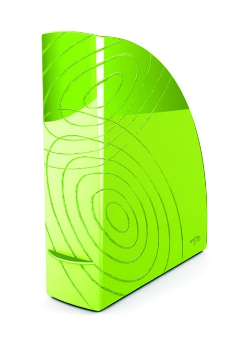 pojemnik na czasopisma, wykonany z odpornego na pęknięcia i odkształcenia polistyrenu w 100% recyklowanegoszerokość grzbietu: 80mmpojemność: ok. 750 kartek o gramaturze 80gsm i maksymalnym rozmiarze 24x32cmna grzbiecie uchwyt ułatwiający zdejmowanie z półkiniski próg do łatwego wyjmowanie materiałóworyginalny design wzorowany na motywach z przyrodywymiary: 82x310x259mmkolor zielony