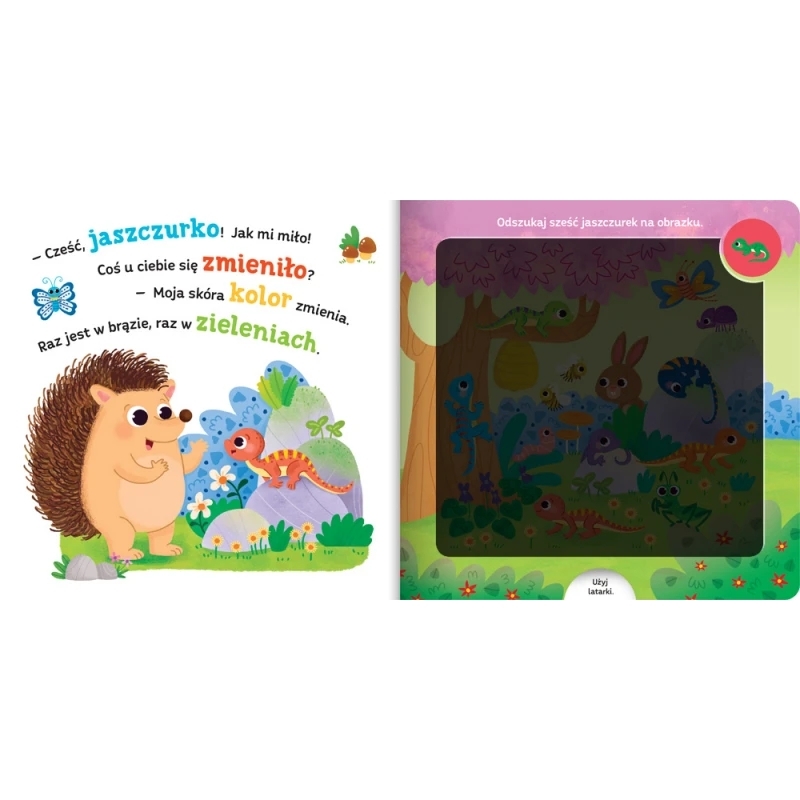 Zabawa w poszukiwanie zwierząt na kartach książki z pewnością spodoba się dziecku. Papierowa latarka przyczepiona jest do wstążeczki, dzięki czemu się nie zgubi. Po zabawie należy schować ją do wycięcia w książeczce.