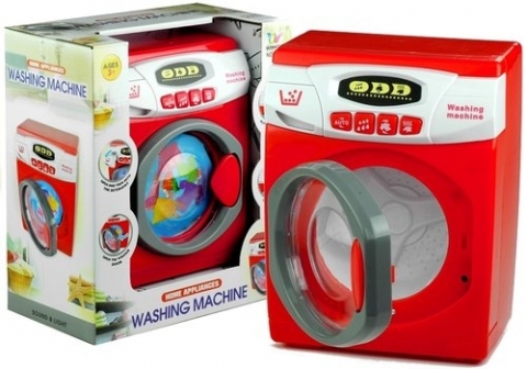 Grająca i świecąca pralka automatyczna dla dzieciZabawki naśladujące prawdziwe sprzęty AGD są rewelacyjnym prezentem dla każdego malucha, który chce móc pomagać swym rodzicom, a także obsługiwać różne urządzenia. Zabawa pozwalająca w prosty sposób naśladować dorosłych oswoi dziecko z przyszłymi obowiązkami domowymi, a ponadto sprawi, że nie będą one dla dziecka karą, a przyjemnością. Własna pralka będzie również fenomenalnym dodatkiem do zabawy w dom, gdzie dziewczynka lub chłopiec będą mogli dbać o swoje zabawki, piorąc ich ubranka.Wygląd zabawkowej pralki niemal do złudzenia przypomina jej pełnowymiarowy odpowiednik. Czerwona pralka posiada biały panel z czterema przyciskami, a także podświetlany programator oznaczający etapy prania. Pierwszy przycisk oznacza pranie automatyczne, drugi ? nabieranie wody, trzeci ? wirowanie, natomiast ostatni ? suszenie ubranek. Każdemu z nich towarzyszą dźwięki nawiązujące do każdego cyklu, a także podświetlony obrazek. W bocznej części panelu umieszczona jest wysuwana szufladka, w której dziecko może umieścić detergent do prania.Bęben pralki posiada szarą ramkę oraz trójkątny przycisk, ułatwiający otwieranie drzwiczek. Po umieszczeniu w bębnie ubranek lalek lub misiów, a następnie wybraniu programu prania, bęben kręci się ? jego tempo zależne jest od etapu prania. Przeźroczyste drzwiczki pozwolą małej gosposi na obserwowanie wirujących ubranek ? po zakończeniu zabawy pralka pika, sygnalizując, że już można wyciągnąć z niej suche, świeże stroje.Zabawkowa pralka zasilana jest 3 sztukami baterii AA 1,5 V, które nie są dołączone do zestawu. Sprzęt w całości wykonany jest z wysokogatunkowego, atestowanego materiału, jakim jest plastik. Konstrukcja zabawki pozbawiona jest ostrych zakończeń, dzięki czemu jest to bardzo bezpieczna propozycja zabawy. Dziecięca pralka posiada certyfikat CE, jest zgodna z normą EN 71. Zabawka zapakowana jest w estetyczny kartonik z otwartą witrynką, dzięki czemu rewelacyjnie nadaje się jako prezent dla dziecka.Wymiary pralki:- 16,5 cm x 22 cm x 10,5 cm.Wymiary opakowania zabawki:- 24 cm x 27 cm x 13,5 cm.
