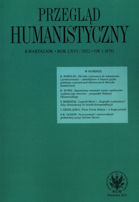 Radosław Pawelec – Od tabu i prewencji do romantyzmu i permisywności – samobójstwow historii języka polskiego i powieściach historycznych Henryka Sienkiewicza Kamila Supeł – Zapomniany romantyk versus współczesne wydania jego utworów – przypadekTomasza OlizarowskiegoPiotr Bordzoł – Leopold Méyet i „biografia wydawnicza” Elizy Orzeszkowej (w świetlekorespondencji)Izabela Grzelązka – Proza Pawła Sołtysa – w kręgu poetyki Ewa Róża Janion – Nowoczesność i uniwersalność grekańskiej poezji Salvina NuceryRECENZJE I PRZEGLĄDYFilip Konarowski – Przypadek Sowinskiego