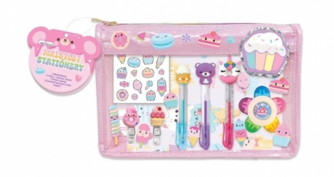 Zestaw zawiera: - kołozeszyt sketchbook - 3 długopisy żelowe z ozdobnymi nakładkami - arkusz naklejek - 2 klamerki z ozdobnymi nakładkami - pieczątki w rollerze w 5 kolorach i wzorach Zestaw zapakowany w ozdobną saszetkę zamykaną na zamek z uchwytem do wygodnego przenoszenia. Wiek: 5+