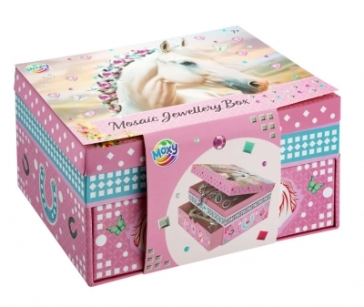 To pudełko na biżuterię z nadrukiem koni łączy w sobie zabawny design z praktyczną przestrzenią do przechowywania. Na pokrywie widnieje elegancka biała głowa konia, ozdobiona wieńcem z różowych mozaikowych kamyczków i subtelnymi motylkowymi detalami. Zewnętrzna strona ma różową kolorystykę ze wzorami, podkowami i drobnymi akcentami, które przypadną do gustu dzieciom i miłośnikom koni.