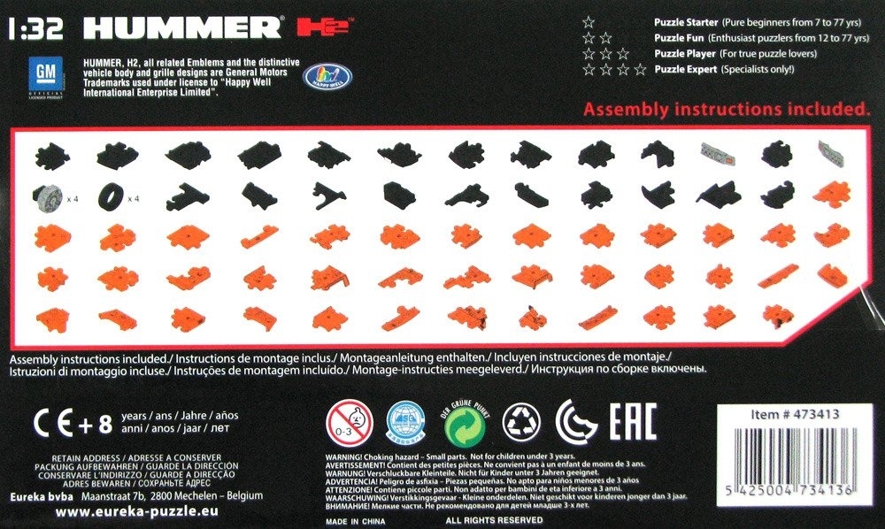 Hummer H2 z serii 3D Cars to 70 plastikowych puzzli. Twoim zadaniem jest złożenie trójwymiarowego modelu samochodu w skali 1:32. Okazuje się, że pozornie prosta czynność, w tych okolicznościach staje się nie lada wyzwaniem.