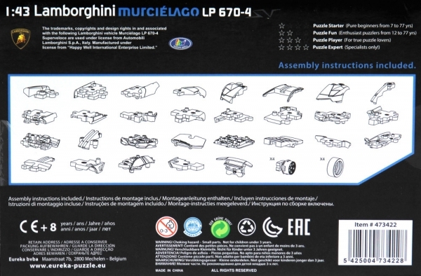 Lamborghini Murcielago z serii 3D CARS to 37 plastikowych puzzli. Twoim zadaniem jest złożenie trójwymiarowego modelu samochodu w skali 1:43. Okazuje się, że pozornie prosta czynność, w tych okolicznościach staje się nie lada wyzwaniem.