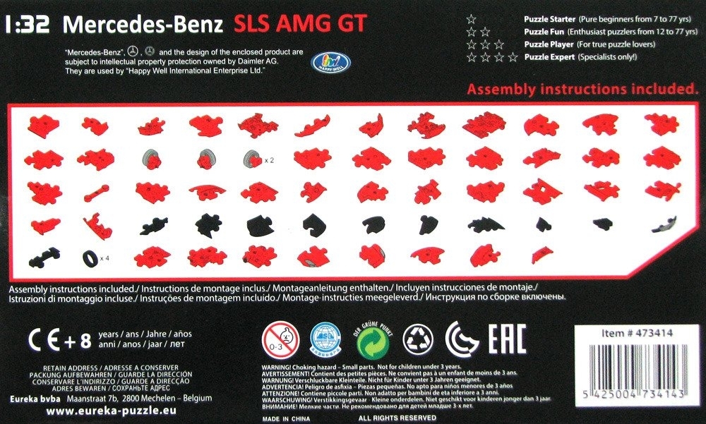 Mercedes SLS AMG GT z serii 3D Cars to 62 plastikowe puzzle. Twoim zadaniem jest złożenie trójwymiarowego modelu samochodu w skali 1:32. Okazuje się, że pozornie prosta czynność, w tych okolicznościach staje się nie lada wyzwaniem.