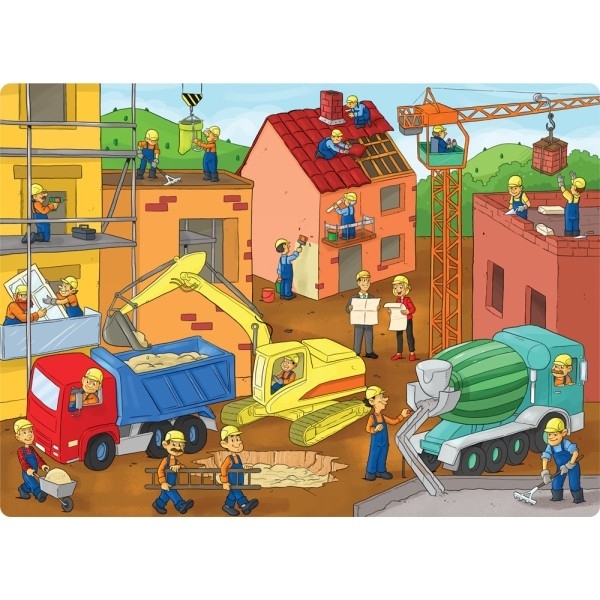 Z puzzlami "Na placu budowy" dzieci mogą przenieść się w sam środek budowy i obserwować pracę fachowców. Opakowanie zawiera 70 dużych elementów które po ułożeniu utworzą obrazek o wymiarach 45 x 32,5 cm.