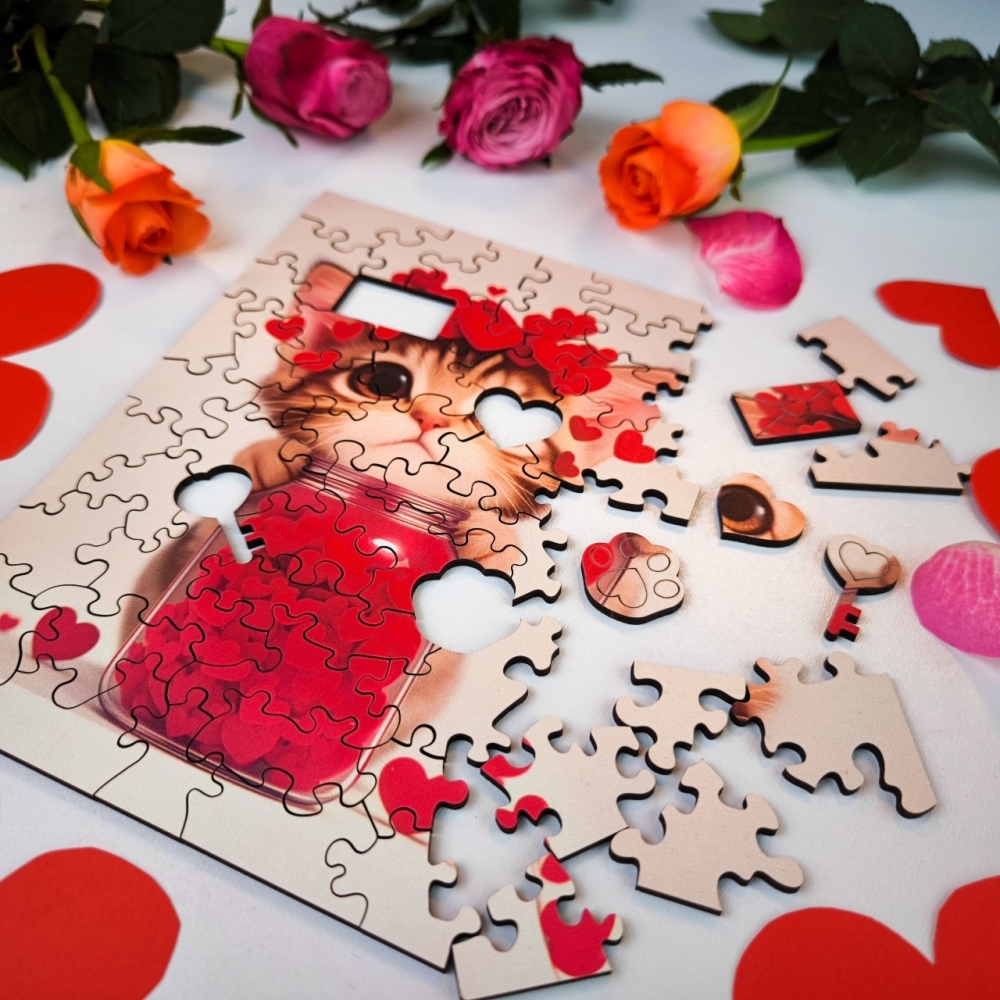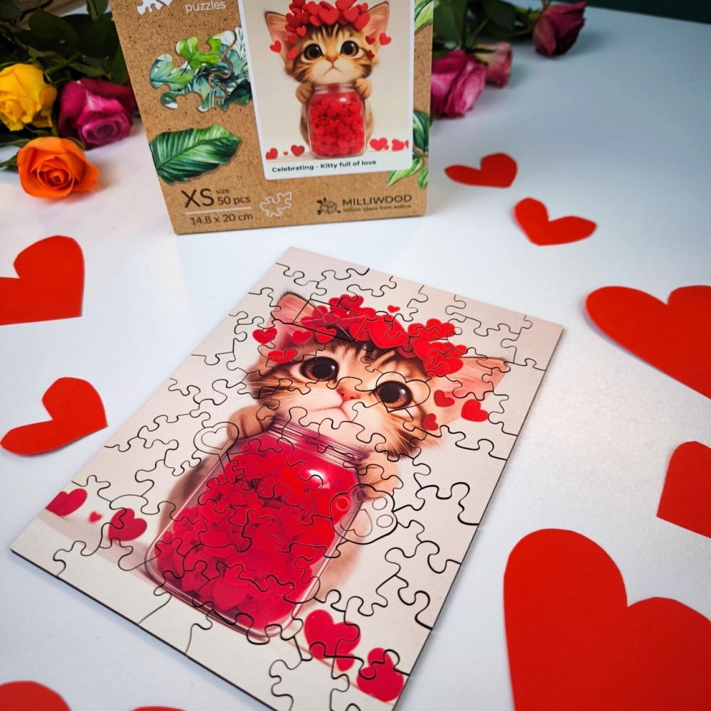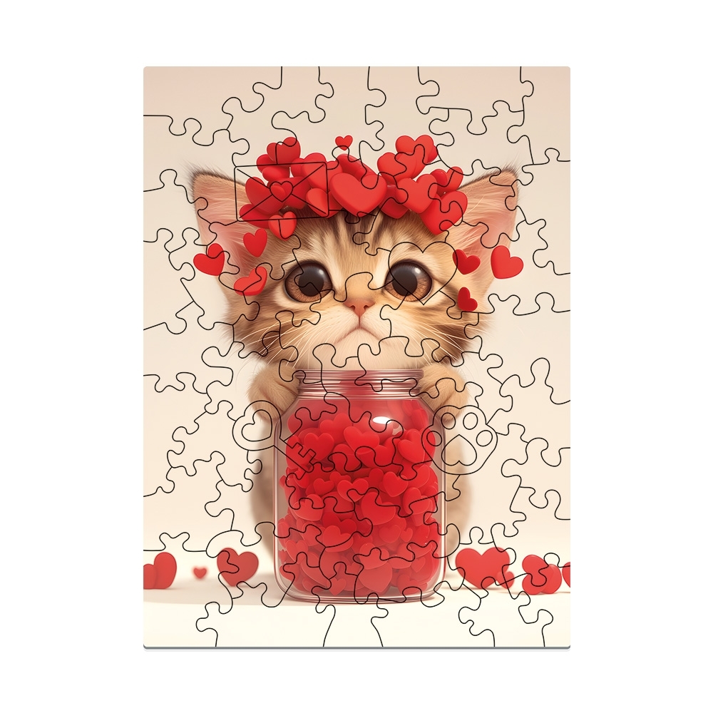 Ta urocza układanka, składająca się z 50 elementów o nieregularnych kształtach, przedstawia słodkiego kotka trzymającego słoik pełen serduszek. To idealne połączenie zabawy, kreatywności i uroku, które sprawi radość każdemu dziecku.