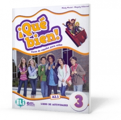 Pełnokolorowy zeszyt ćwiczeń do trzeciej części kursu języka hiszpańskiego dla dzieci !Qué bien! - curso de espanol para ninos wraz z nagraniami audio online.