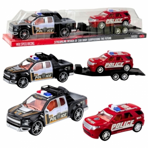Zestaw policyjny z lawetą to doskonała propozycja dla dzieci, które uwielbiają dynamiczną zabawę i fascynują się światem służb mundurowych. W skład kompletu wchodzi potężny czarny samochód terenowy z przyczepą-lawetą oraz czerwony pojazd policyjny. Taki zestaw umożliwia odgrywanie realistycznych scenariuszy pościgów, transportu i akcji specjalnych, rozwijając przy tym wyobraźnię i kreatywność dziecka.