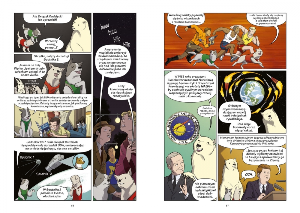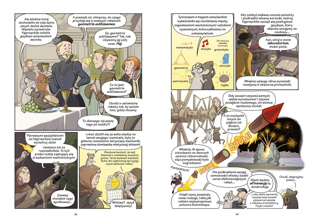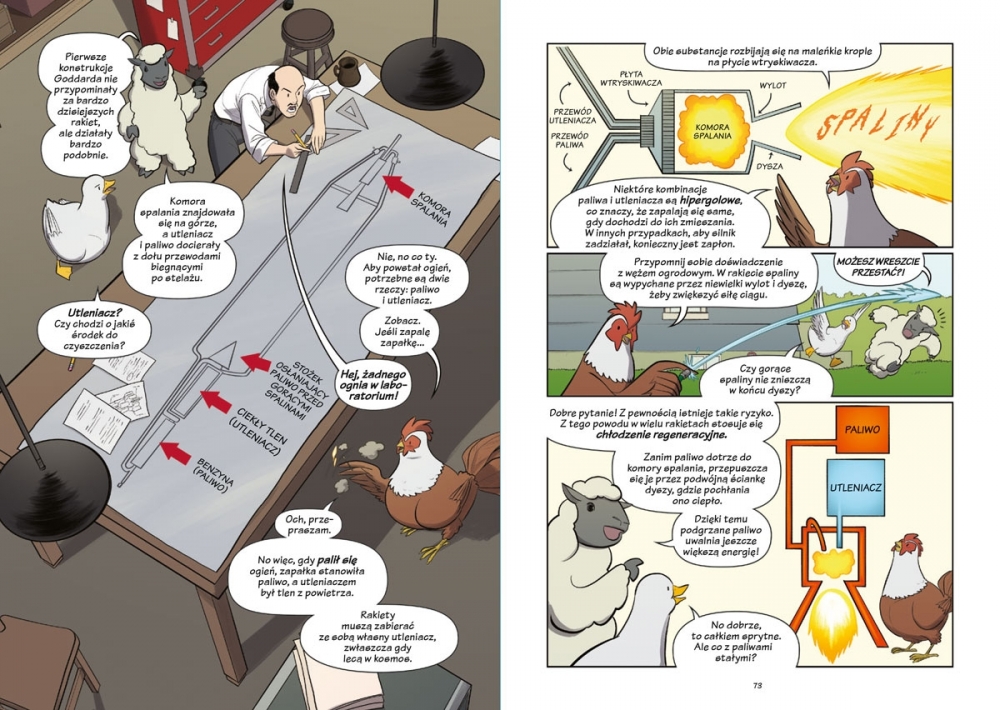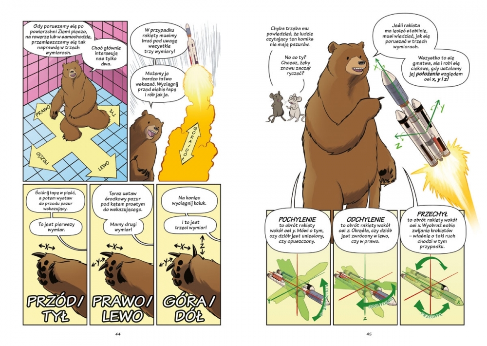 Poznaj naukowców wizjonerów (a także myszy, niedźwiedzie, żółwie i inne zwierzęta!), dzięki którym RAKIETY używane dawniej do organizowania wspaniałych pokazów stały się najpotężniejszymi pojazdami, jakie zna ludzkość. Z tego naukomiksu dowiesz się również, w jaki sposób żyroskop, huśtawka i strumień wody z węża ogrodowego mogą nam pomóc w zrozumieniu zawiłości PODRÓŻY KOSMICZNYCH.