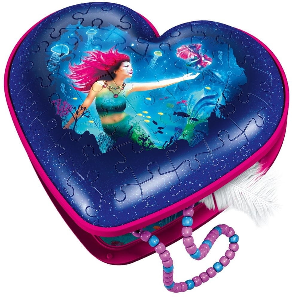 Zabawa z puzzlami 3D, która zachwyci wszystkich! Zanurz się w kolorowym świecie syren i ułóż piękne i solidne pudełko w kształcie serca z 54 plastikowych elementów!