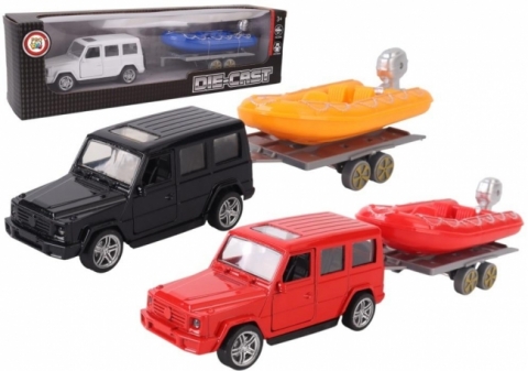 Samochód z łodzią pontonową na przyczepie mix