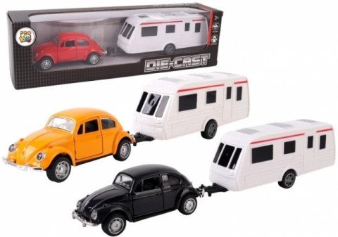 Wyrusz w podróż marzeń z metalowym zestawem samochodu z przyczepą kempingową marki PRO Kids! Ten realistyczny zestaw łączy klasyczny design auta z funkcjonalnością nowoczesnej przyczepy turystycznej, stwarzając idealną scenę do zabawy w podróże, biwaki i rodzinne wakacje. Samochód typu garbus o opływowym kształcie i błyszczącym lakierze przyciąga wzrok, a jego otwierane drzwi i funkcja pull-back dostarczają dynamicznych wrażeń podczas zabawy.