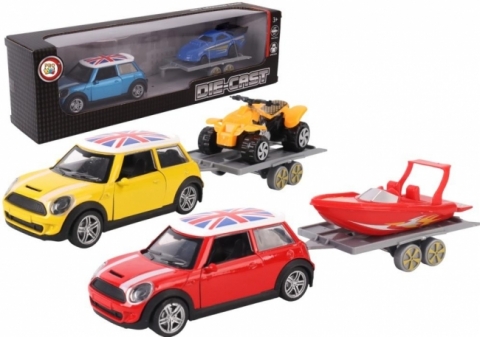 Pojazd główny terenówka z solidną, metalową karoserią zachwyca detalami i trwałością. Dzięki napędowi typu pull-back i otwieranym drzwiom zaprasza do wielokrotnych scenariuszy zabawy: załadunku, transportu i akcji ratunkowej. Przyczepa, mocowana na zaczep, mieści jedną z trzech wersji ładunków sportową łódź, kolorowego quad lub aerodynamiczny samochód wyścigowy każdy z nich stylizowany z dbałością o najmniejsze szczegóły.