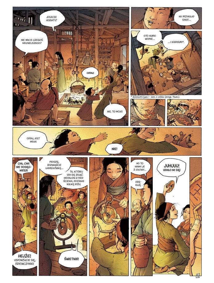 Średniowieczna Japonia. Jeden z możnowładców, generał Akuma, potajemnie dąży do obalenia panującego cesarza. W tym czasie Takeo, pozbawiony pana samuraj, wraz z niezdarnym uczniem Shiro wyrusza na poszukiwanie prawdy o swoim pochodzeniu. Po drodze pomagają grupie podróżnych napadniętych przez bandytów. Kiedy później jedna z uratowanych dziewczynek rozwiązuje rzekomo niemożliwą do rozwiązania łamigłówkę o znaczeniu religijnym, czworo podróżnych musi uciekać przed siłami zła, które są gotowe zrobić wszystko, by pojmać dziewczynkę. Świetnie zarysowane postacie bohaterów, wciągający scenariusz i porywające rysunki przedstawiające średniowieczną Japonię tworzą niezwykły klimat tej powieści graficznej.