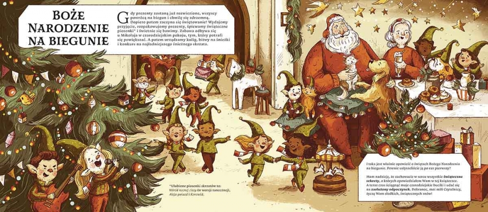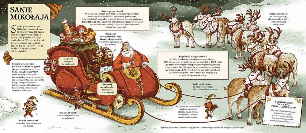 Ileż sekretów się za tym wszystkim kryje! Dlaczego Mikołaj nosi czerwony płaszcz? Jak udaje mu się objechać świat jednej nocy? Co sprawia, że renifery latają? Jak wszystkie podarki mieszczą się na saniach? Czy elfy naprawdę produkują zabawki? I wszyscy mieszkają razem na Biegunie Północnym?