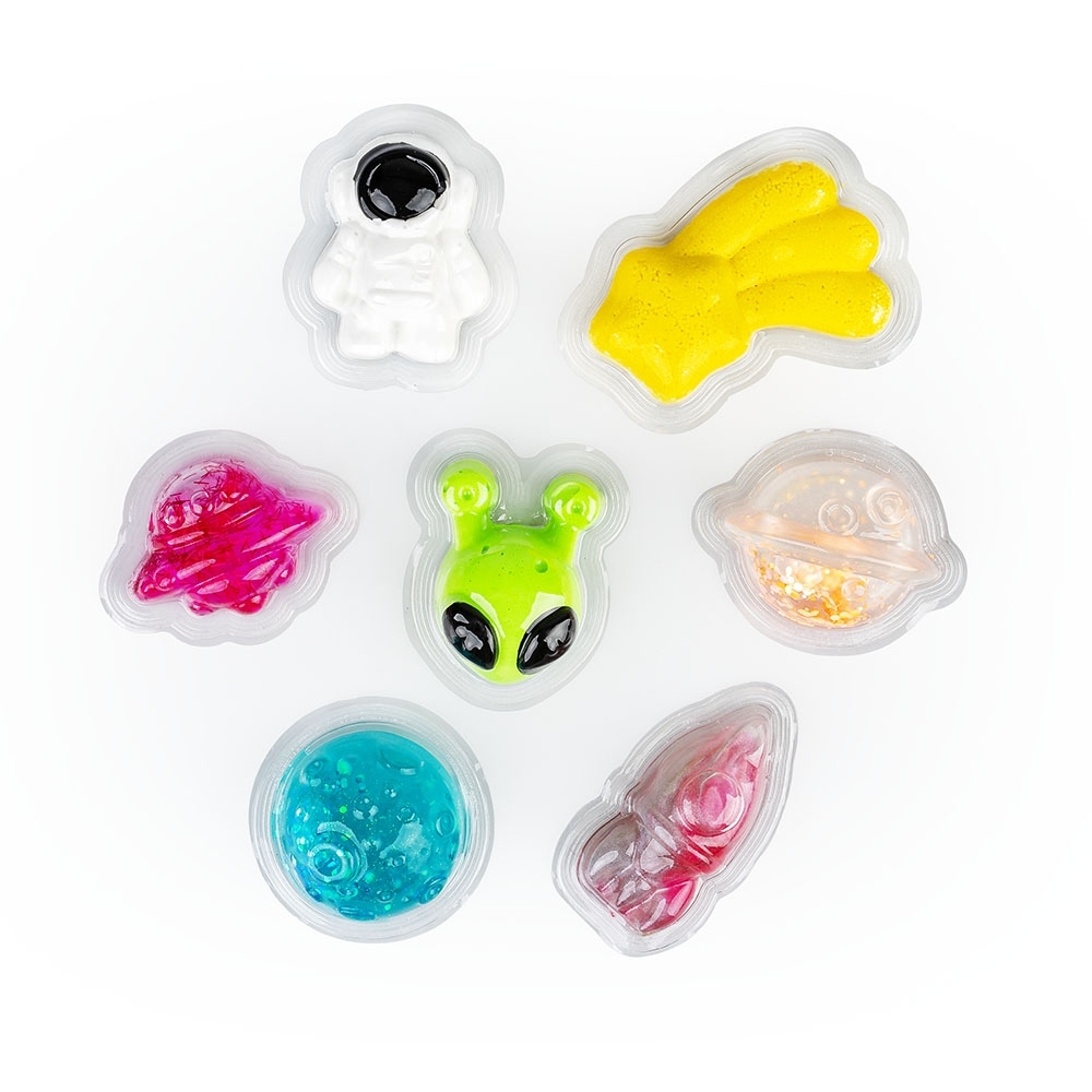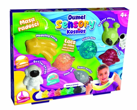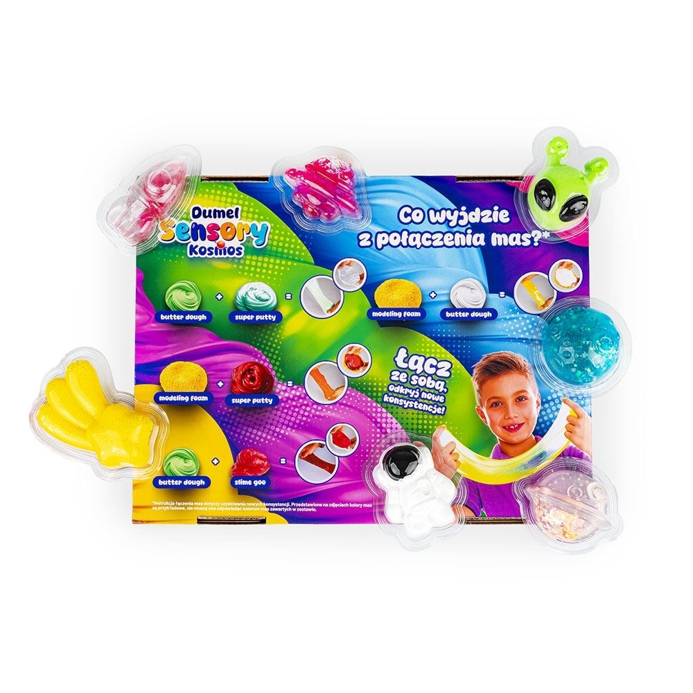 Ale kosmos! W galaktycznych kształtach, tworzących zestaw, znajdują się kolorowe masy o różnych konsystencjach. Zbadaj każdą z nich, ugniatając i rozciągając, a następnie połącz masy ze sobą, odkrywając nowe kolory i wykończenia.