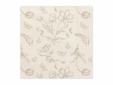 Papierowe serwetki w kolorze beżowym z ciemnobeżowymi kwiatami. Wymiary po rozłożeniu ok. 33 x 33 cm, wymiary po złożeniu ok. 16.5 x 16.5 cm.(1 op. / 12 szt.)