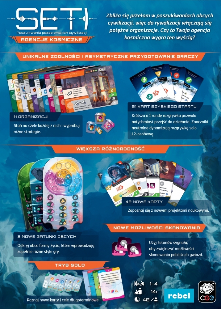 SETI: Poszukiwania pozaziemskich cywilizacji - Agencje kosmiczne to rozszerzenie wprowadzające asymetryczne warunki początkowe – od tej pory każdy z graczy będzie reprezentował inną firmę z własnym zestawem narzędzi i umiejętności, co pozwoli na wypróbowanie zupełnie nowych strategii. Oprócz tego w pudełku znajdziemy 3 nowe gatunki obcych z unikalnym zestawem zasad oraz ponad 40 nowych kart inspirowanych rzeczywistymi projektami naukowymi.