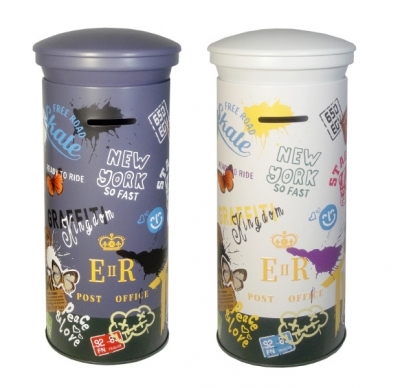 Skarbonka w kształcie wysokiej skrzynki pocztowej z kolorowymi nadrukami. Dostępna w dwóch wariantach kolorystycznych – ciemnym i jasnym, kolor wybierany losowo. Zabawka przeznaczona dla dzieci od lat 3. Podane wymiary są wymiarami skarbonki.