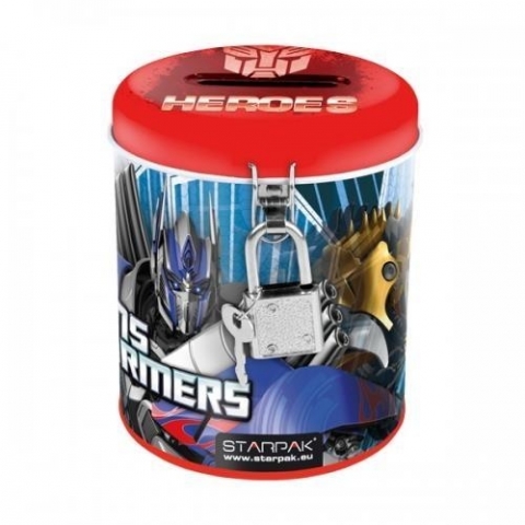 Skarbonka z lakierowanego metalu, zamykana na kłódkę. Zdobiona motywami Transformers.
