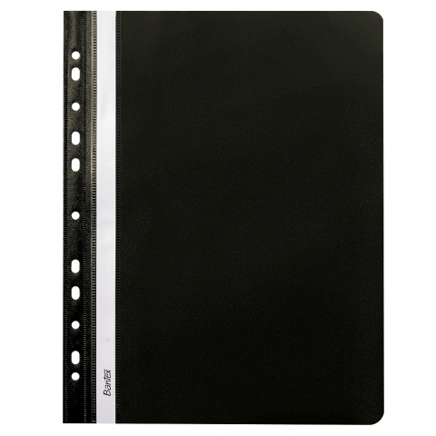 Klasyczne skoroszyty w formacie A4, wykonane z polipropylenowej folii. Przednia okładka o grubości 120 mic. jest przezroczysta dla doskonałej widoczności dokumentów. Tylna okładka o grubości 170 mic. została wykonana z nieprzezroczystej, czarnej folii. Metalowe wąsy bezpiecznie mocują dokumenty w skoroszycie. Na grzbiecie znajduje się wymienny pasek do opisu zawartości. Uniwersalna perforacja umożliwia wpięcie skoroszytów do każdego segregatora.
