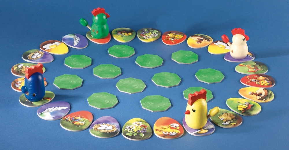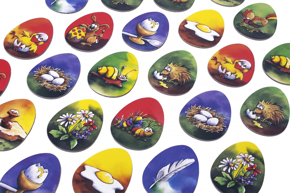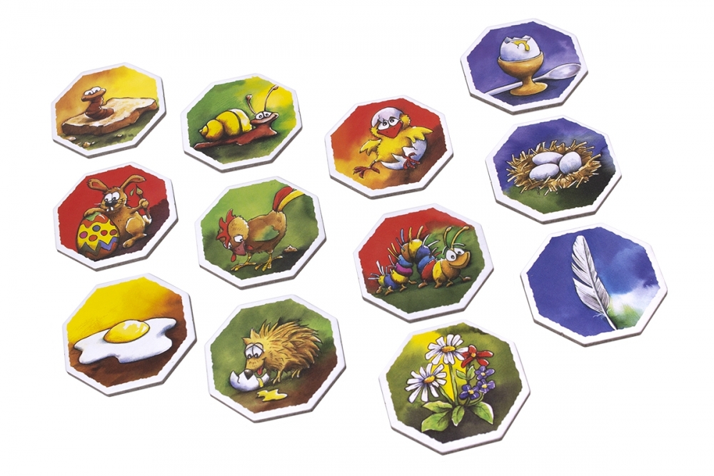 - Kafelki jajek rozkładamy odkryte losowo tak, aby tworzyły okrąg. Wewnątrz rozkładamy zakryte kafelki wybiegu dla kur. Figurki kur rozstawiamy na jajkach w równych odstępach od siebie.