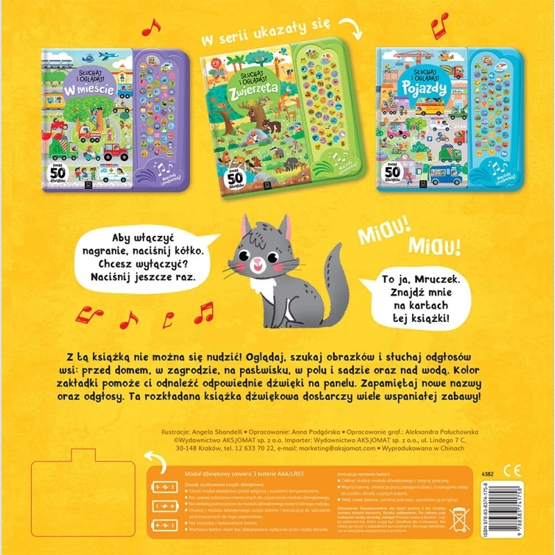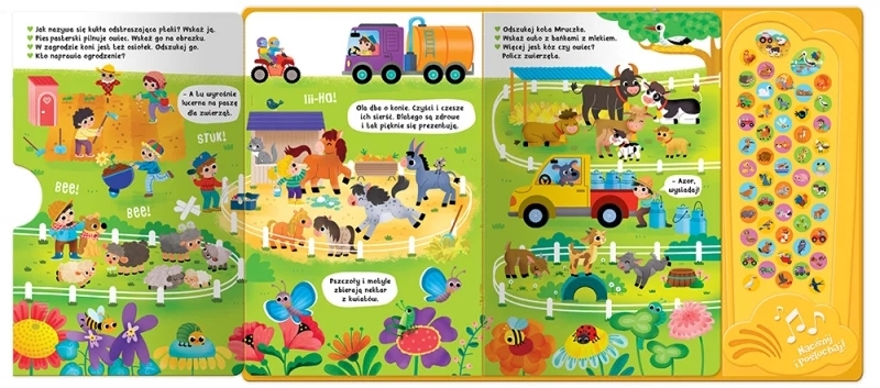 Pięć bogato ilustrowanych rozkładówek ze zwierzętami i wiejskimi pojazdami, a na nich: dom i podwórko na wsi, zwierzęta na pastwisku, zwierzęta w zagrodzie, pole i sad, wiejski staw i jego otoczenie. Oglądaj ilustracje, a potem odpowiadaj na zadane pytania, szukaj wskazanych zwierzaków i innych elementów ilustracji, a przede wszystkim słuchaj ponad 50. odgłosów. Kolor zakładki pomoże ci odnaleźć odpowiednie dźwięki na panelu. Aby włączyć nagranie, naciśnij kółko. Chcesz wyłączyć? Naciśnij kółko jeszcze raz. Zapamiętaj nazwy pojazdów i dźwięki ich silników, a także nazwy zwierzaków, ich wygląd i środowisko, w którym występują oraz wydawane przez nie odgłosy.