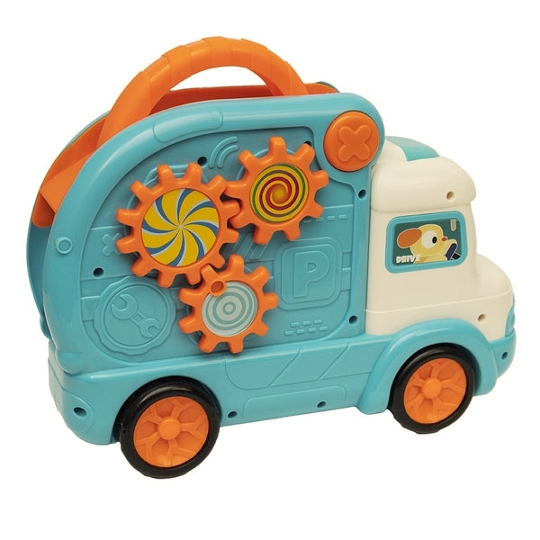 - Całość uzupełniają interaktywne elementy: przyciski uruchamiające silnik, klakson, rolkę z obrazkami oraz obrotowe zębatki.