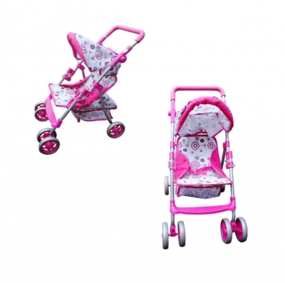 Metalowy wózek do składania w różowo-szarym kolorze w kwiatowe wzorki.
