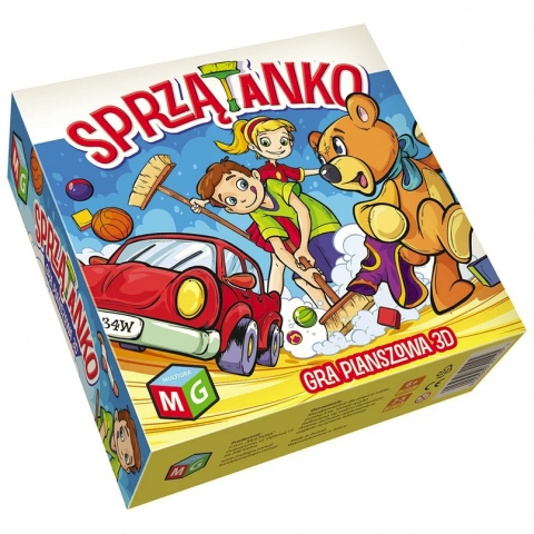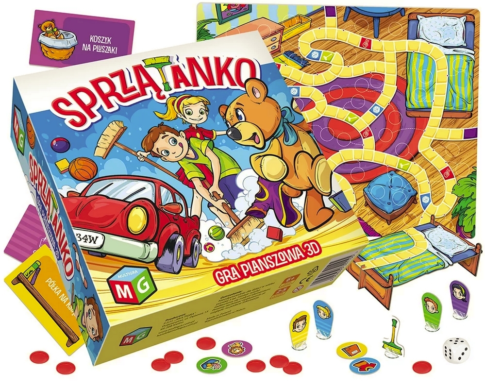 Elementy 3D sprawiają, że poczucie realizmu znacznie wzrasta, a zabawa nabiera rumieńców. Rozłóż planszę z imitacją pokoju, rozrzuć elementy w wyznaczone miejsca i ruszaj do pracy… to znaczy do zabawy! Zadaniem każdego gracza jest odłożenie do specjalnie przygotowanych pojemników, jak największej liczby drobiazgów. Pomoże Ci w tym mała miotła, którą wymieciesz wszystko spod łóżka. Sprawdź, kto sprząta dokładnie i szybko! Gra sprawia wiele frajdy, ucząc przy tym dzieci odpowiednich postaw i pozytywnych skojarzeń na myśl o porządkowaniu pokoju.