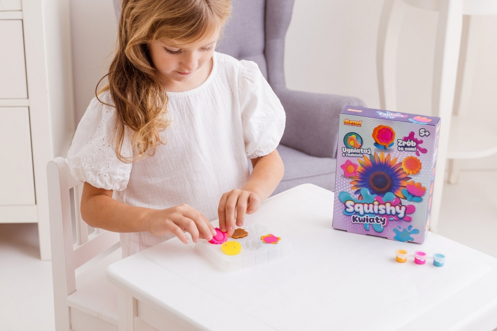 Wystarczy zmieszać ze sobą klejące masy, rozlać je do kubeczków i do każdego z nich dodać barwnik w innym kolorze, a następnie zalać foremkę barwnymi miksturami, zgodnie z własnym pomysłem. W zestawie znajduje się pipeta, która ułatwi aplikowanie niewielkiej ilość mieszanki do foremki, w celu wykonania kwiatkowych detali. Po zapełnieniu foremki, odstaw ją w bezpieczne miejsce do wyschnięcia, a gdy squishy będą już gotowe, delikatnie wyjmij je z foremki.Produkt przeznaczony jest dla dzieci od 5 roku życia.