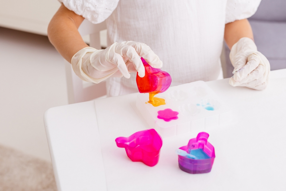 - w zestawie: 1 x klej A, 1 x klej B, 3 x barwnik, 1 x foremka, 1 x miseczka do łączenia klejów, 3 x kubeczek do łączenia klejów z barwnikiem, 1 x mata wodoodporna, 1 x para rękawiczek foliowych, 3 x mieszadełko, 1 x pipeta;