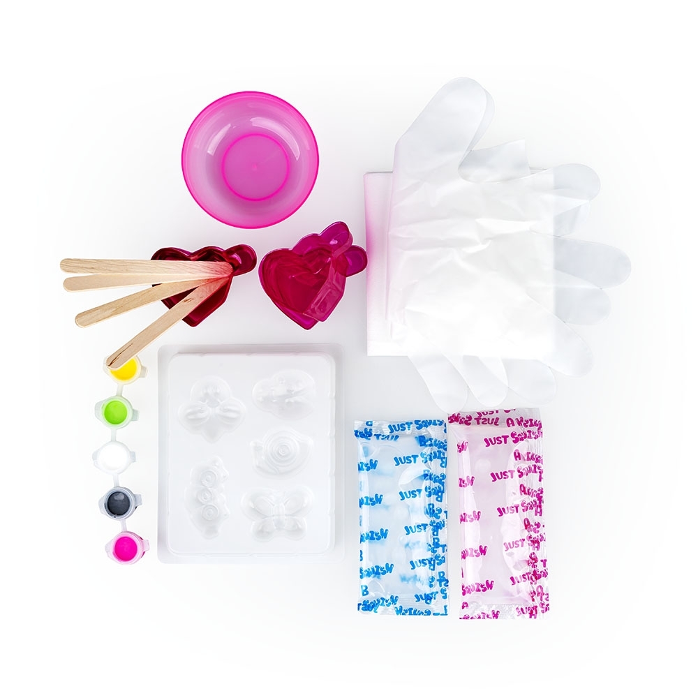 - w zestawie: 1 x klej A, 1 x klej B, 5 x barwnik, 1 x foremka, 1 x miseczka do łączenia klejów, 5 x kubeczek do łączenia klejów z barwnikiem, 1 x mata wodoodporna, 1 x para rękawiczek foliowych, 5 x mieszadełko, 1 x pipeta;