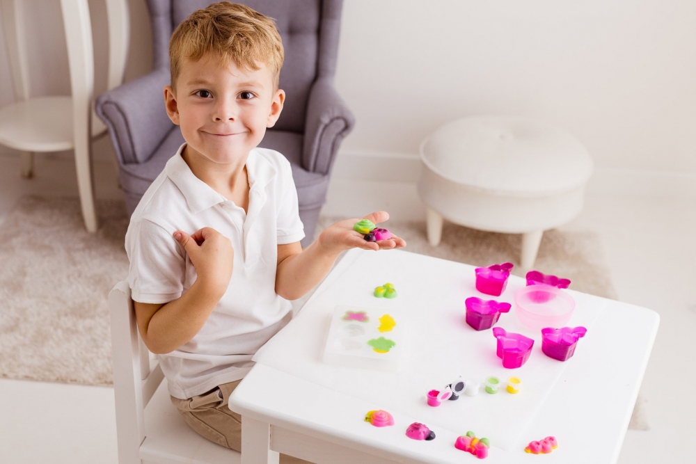 Obudź wyobraźnię i rozwijaj kreatywność, tworząc „gumowe” stworki, zgodnie z własnym pomysłem. Aby rozpocząć zabawę, połącz ze sobą kleje i rozlej je do kubeczków, a następnie do każdego z nich dodaj barwnik w innym kolorze. Teraz wypełnij zagłębienia w foremce mieszankami w różnych kolorach, wlewając do nich miksturę bezpośrednio z kubeczków lub przy użyciu dołączonej pipety, która z pewnością przyda się do wykonania detali, jak kropki, czułki lub oczka. Po zapełnieniu foremki, odstaw ją do całkowitego wyschnięcia, a gdy masa stężeje, delikatnie wyjmij
