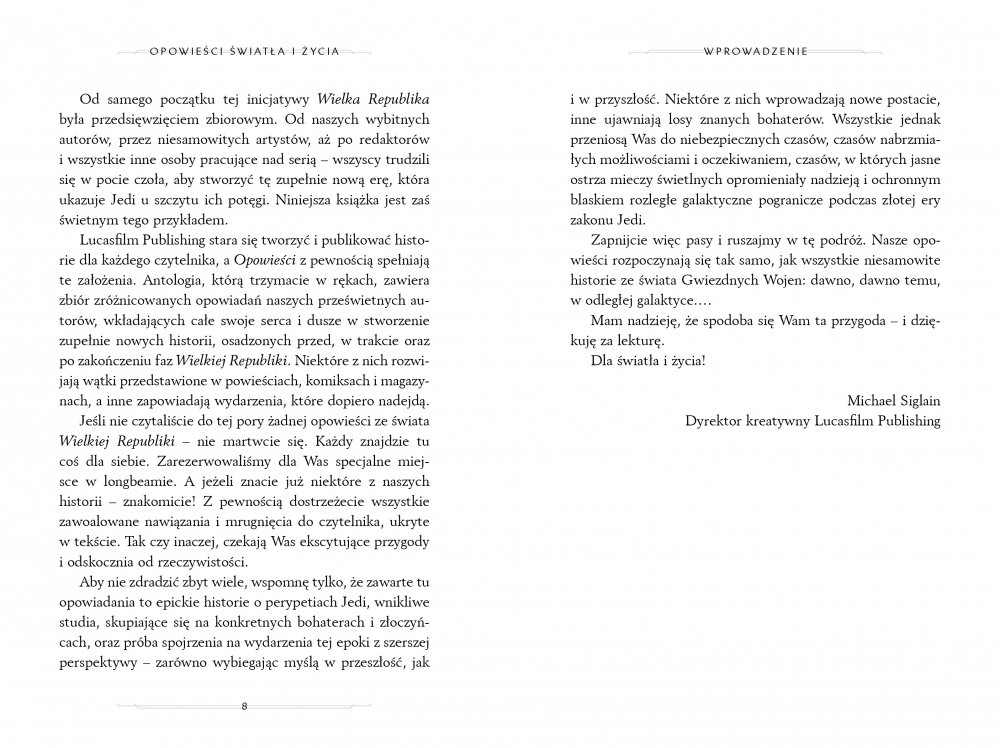 Od krańców Dzikiej Przestrzeni aż po dolne poziomy Coruscant, od Latarni Gwiezdny Blask po eiramski ocean i nie tylko – te opowieści o cudach, rozczarowaniach, pomocy i nadziei pozwalają nam zagłębić się w serca i umysły bohaterów oraz złoczyńców znanych z cyklu Wielka Republika. W tym niesamowitym zbiorze, który odsłania tajemnice przeszłości i dostarcza ekscytujących wskazówek w kwestii tego, co przyniesie przyszłość, spotkamy uwielbiane przez czytelników postacie: Vernestrę Rwoh, Bella Zettifara, Axela Greylarka, Keeve Trennis, Mardę Ro, Affie Hollow, Rama Jomarama i Rooper Nitani. Wszyscy staną przed śmiertelnie groźnymi wyzwaniami i zmierzą się ze zdradą i własnymi demonami...